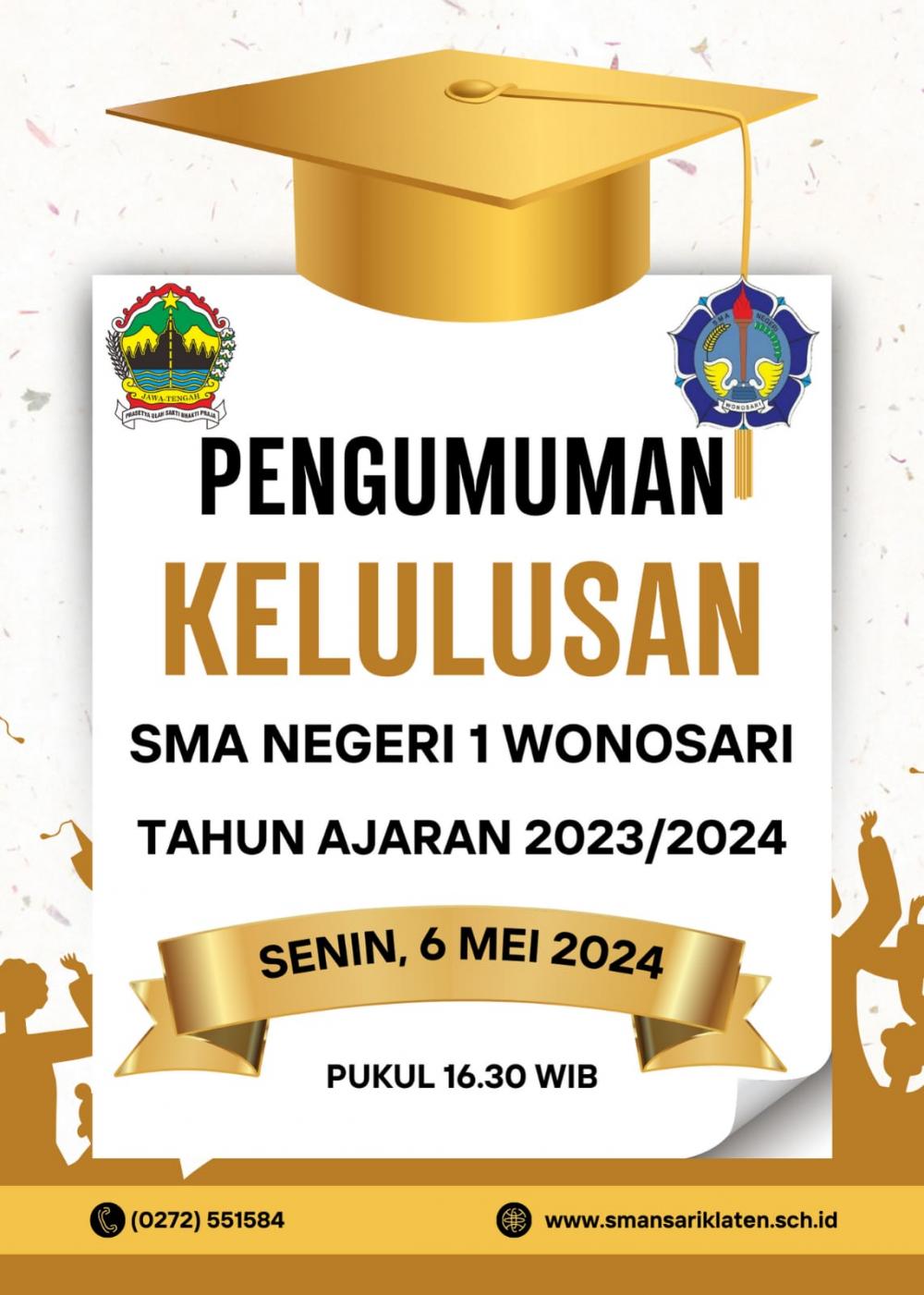 Besok pada hari Senin, tanggal 6 Mei 2024, adalah hari yang sangat dinantikan oleh kita semua. Hari di mana para peserta didik kelas XII tahun ajaran 2023/2024 akan mengakhiri perjalanan mereka di SMA Negeri 1 Wonosari setelah menjalani kurang lebih 3 tahun belajar dan berkarya. Pengumuman kelulusan akan diumumkan mulai pukul 16.30 WIB. Pengumuman kelulusan ini merupakan bukti dari perjuangan kalian selama tiga tahun belajar di SMA Negeri 1 Wonosari.